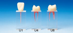 Cámara pulpar y conducto radicular dentro de un bloque transparente con una corona sujeta encima